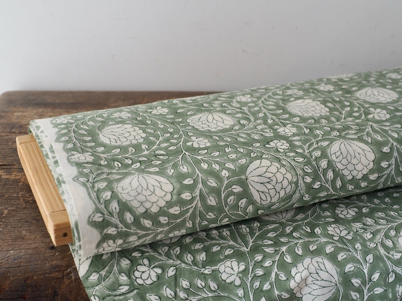 ブロックプリントと呼ばれるインド の伝統的な技法でプリントされた生地。木版で版画のように色を重ねていきます。時には10色以上重ねられることも!それゆえに木版の継ぎ目が見えたり、色むらがあったりしますが、それが一般的なスクリーンプリントにはない、なんとも言えない立体感を生み出しています。