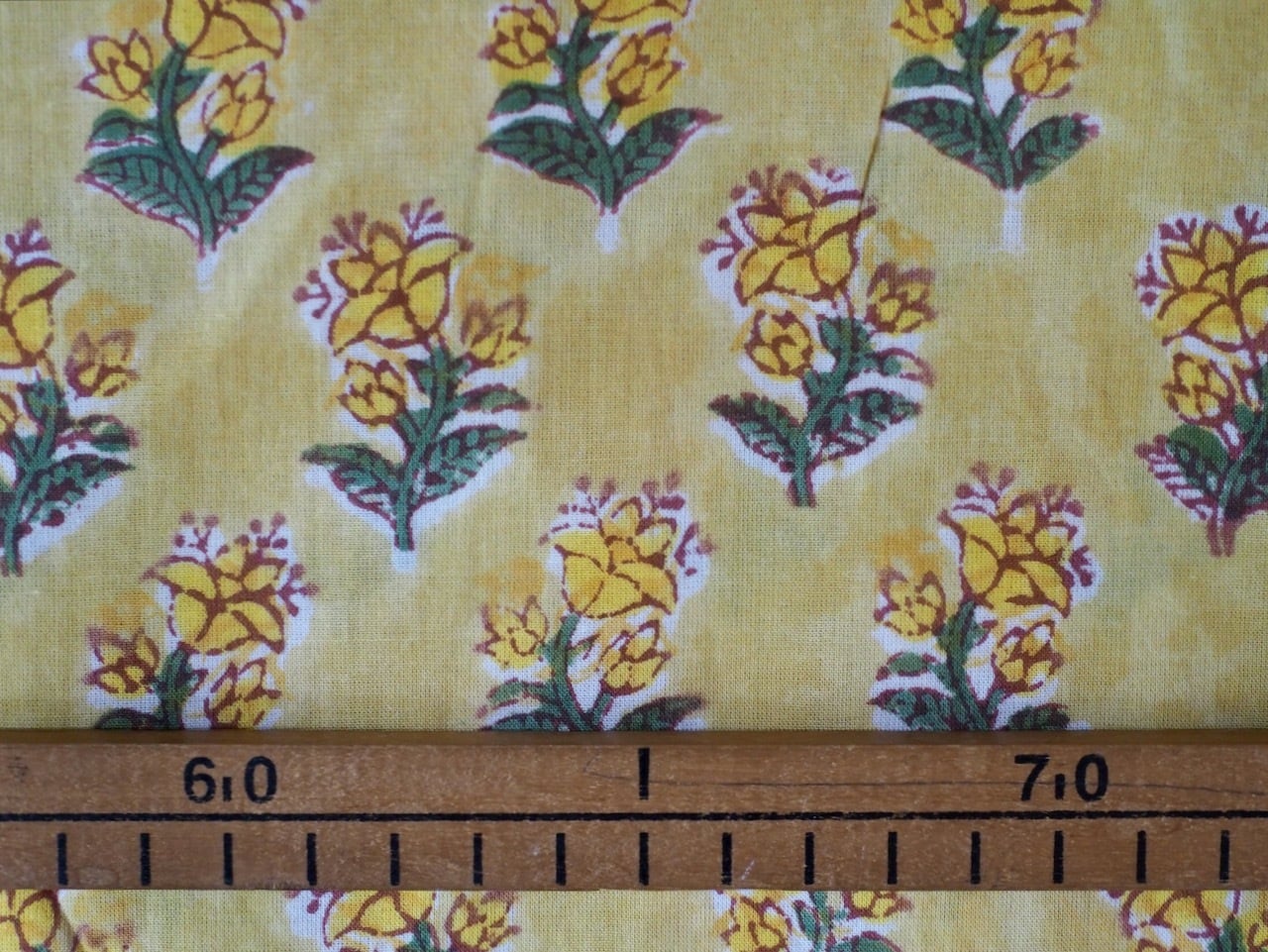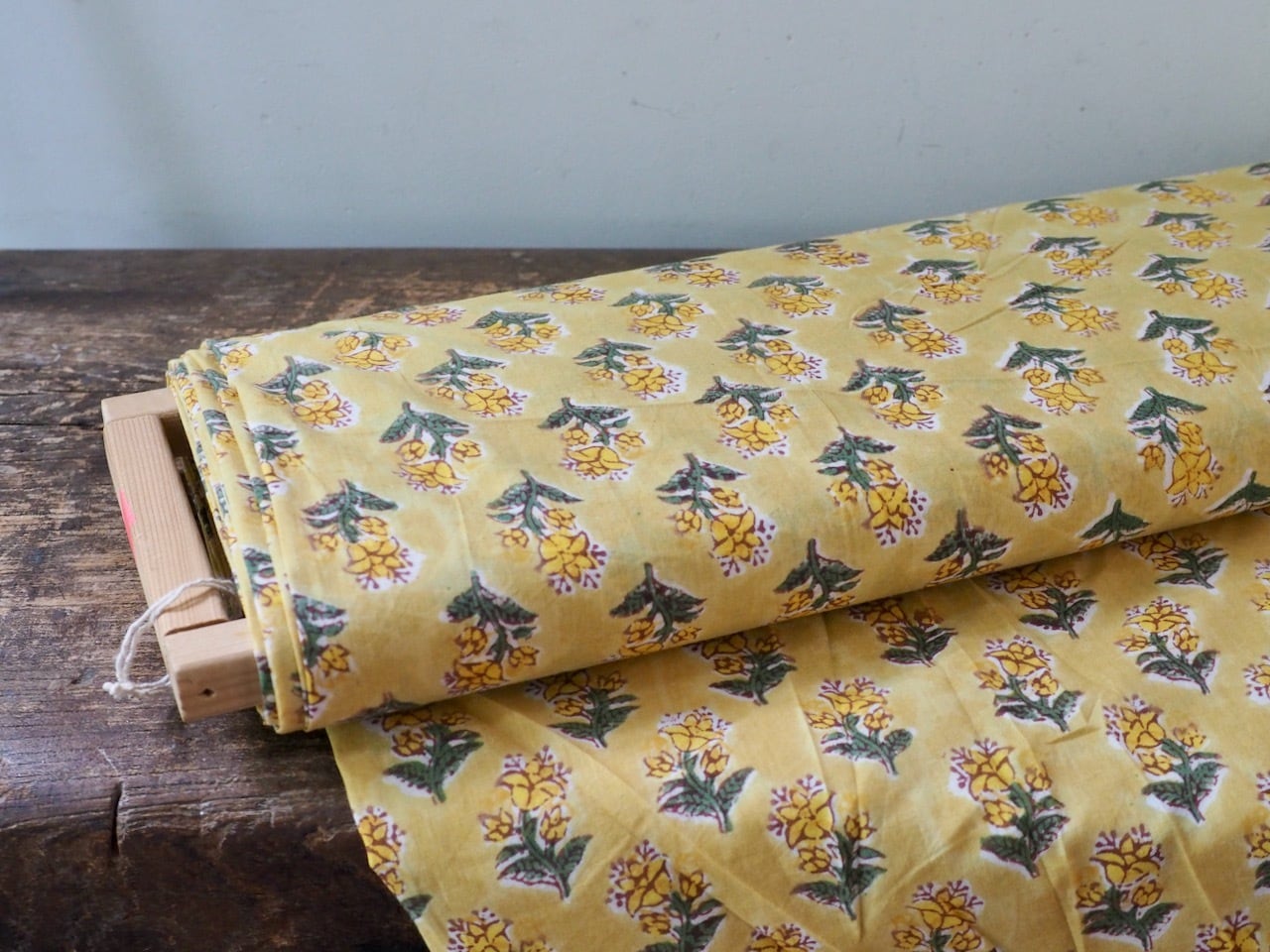 ブロックプリントと呼ばれるインド の伝統的な技法でプリントされた生地。木版で版画のように色を重ねていきます。時には10色以上重ねられることも!それゆえに木版の継ぎ目が見えたり、色むらがあったりしますが、それが一般的なスクリーンプリントにはない、なんとも言えない立体感を生み出しています。