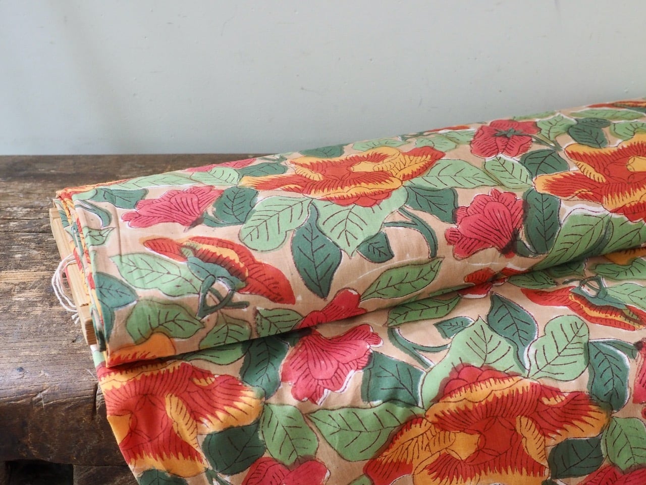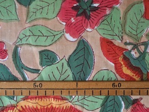 ブロックプリントと呼ばれるインド の伝統的な技法でプリントされた生地。木版で版画のように色を重ねていきます。時には10色以上重ねられることも!それゆえに木版の継ぎ目が見えたり、色むらがあったりしますが、それが一般的なスクリーンプリントにはない、なんとも言えない立体感を生み出しています。