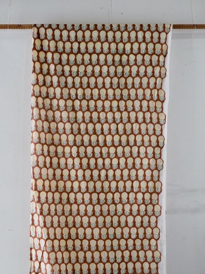 ブロックプリントと呼ばれるインド の伝統的な技法でプリントされた生地。木版で版画のように色を重ねていきます。時には10色以上重ねられることも!それゆえに木版の継ぎ目が見えたり、色むらがあったりしますが、それが一般的なスクリーンプリントにはない、なんとも言えない立体感を生み出しています。