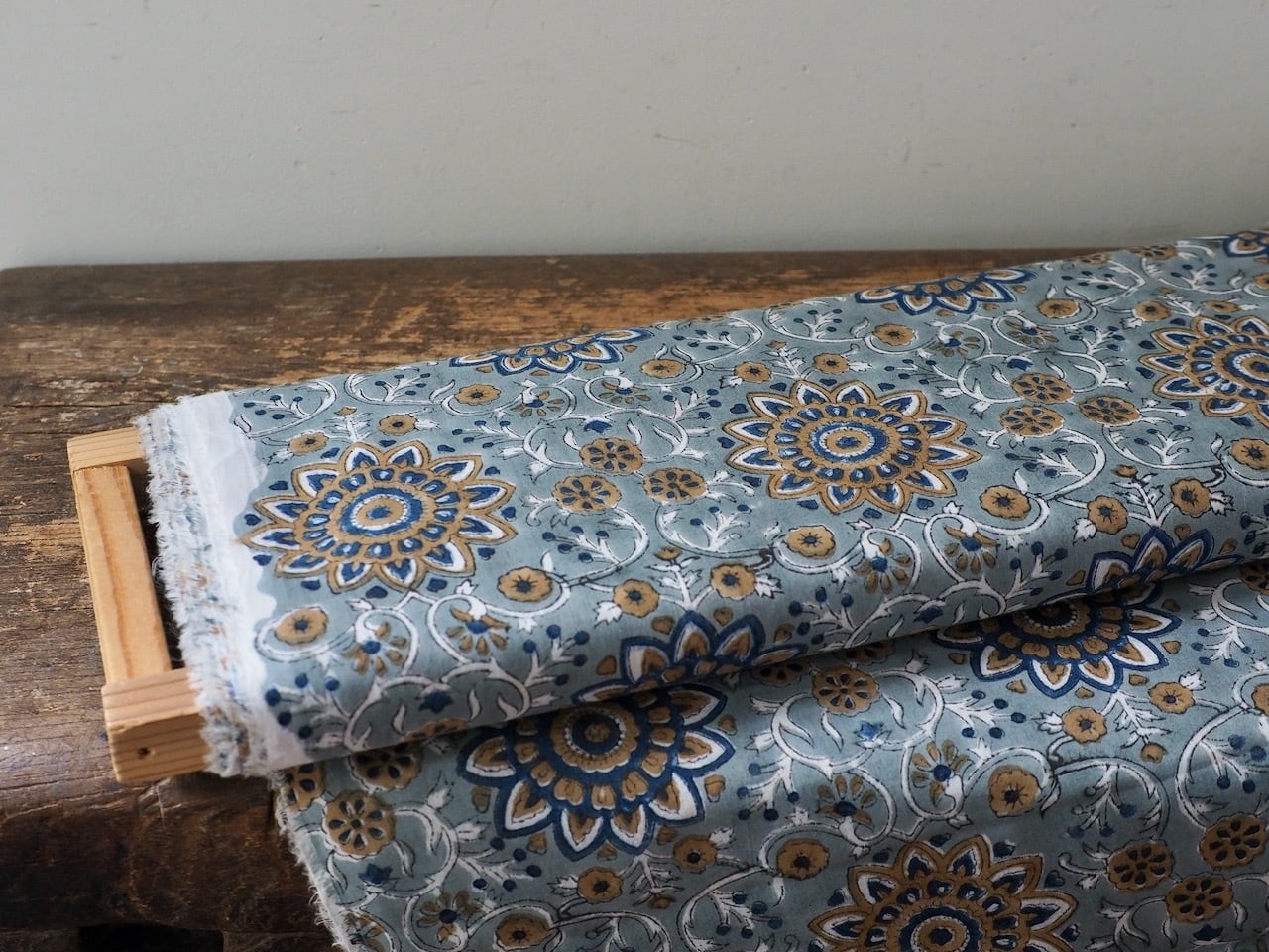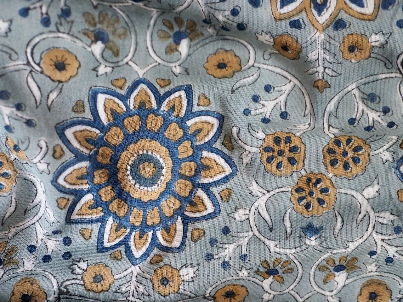 ブロックプリントと呼ばれるインド の伝統的な技法でプリントされた生地。木版で版画のように色を重ねていきます。時には10色以上重ねられることも!それゆえに木版の継ぎ目が見えたり、色むらがあったりしますが、それが一般的なスクリーンプリントにはない、なんとも言えない立体感を生み出しています。