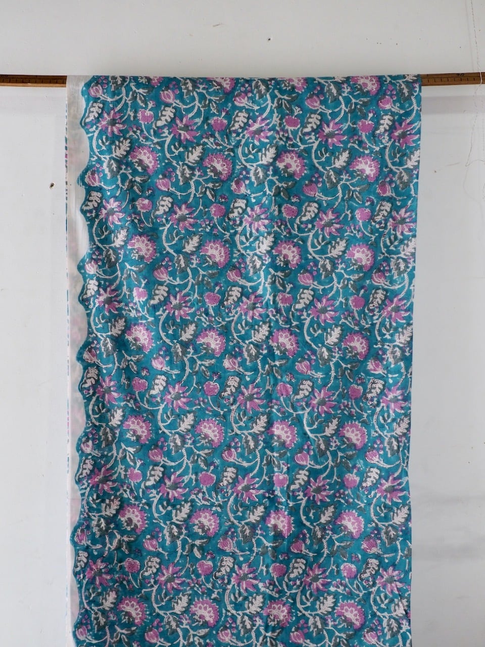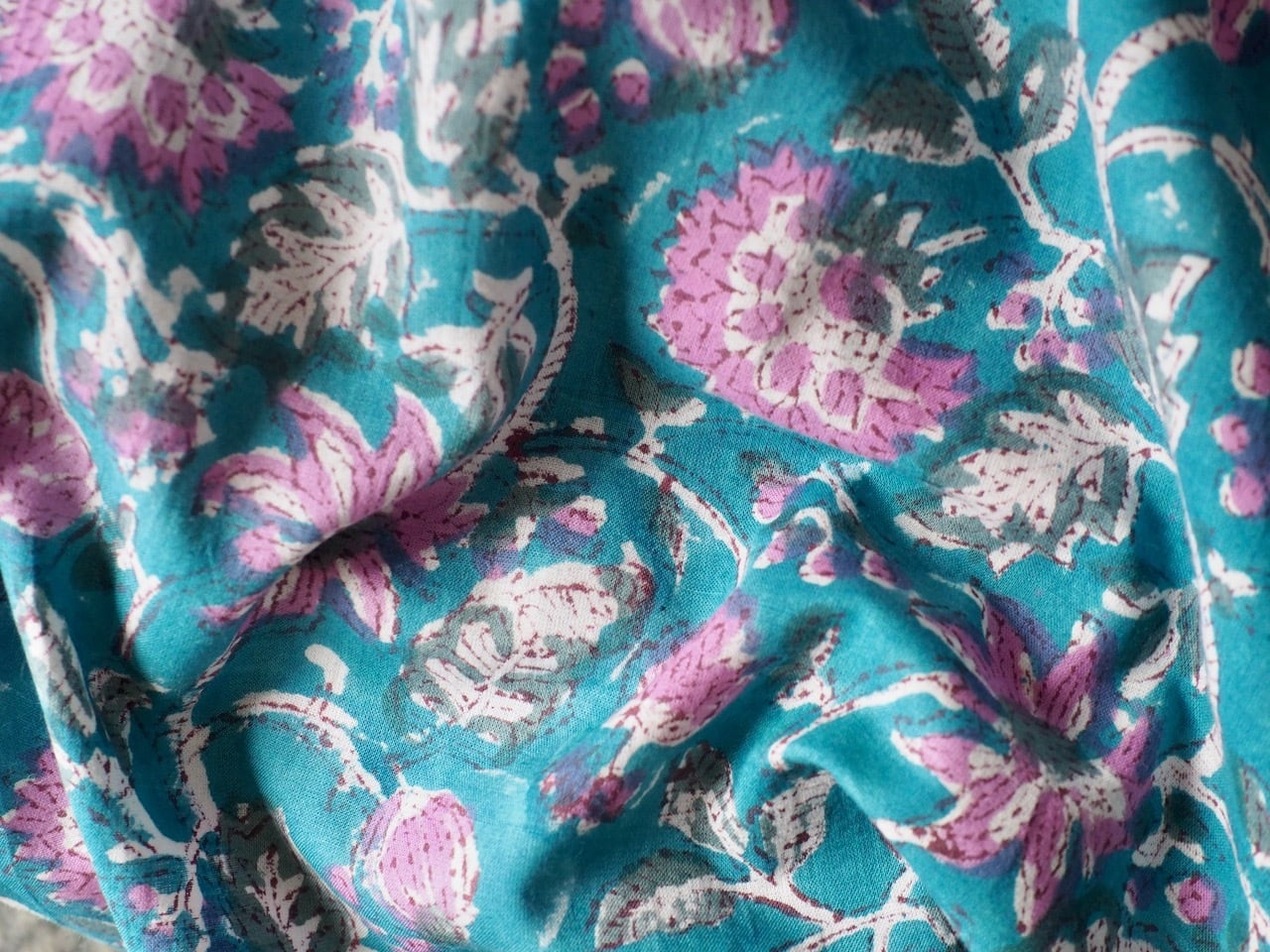 ブロックプリントと呼ばれるインド の伝統的な技法でプリントされた生地。木版で版画のように色を重ねていきます。時には10色以上重ねられることも!それゆえに木版の継ぎ目が見えたり、色むらがあったりしますが、それが一般的なスクリーンプリントにはない、なんとも言えない立体感を生み出しています。