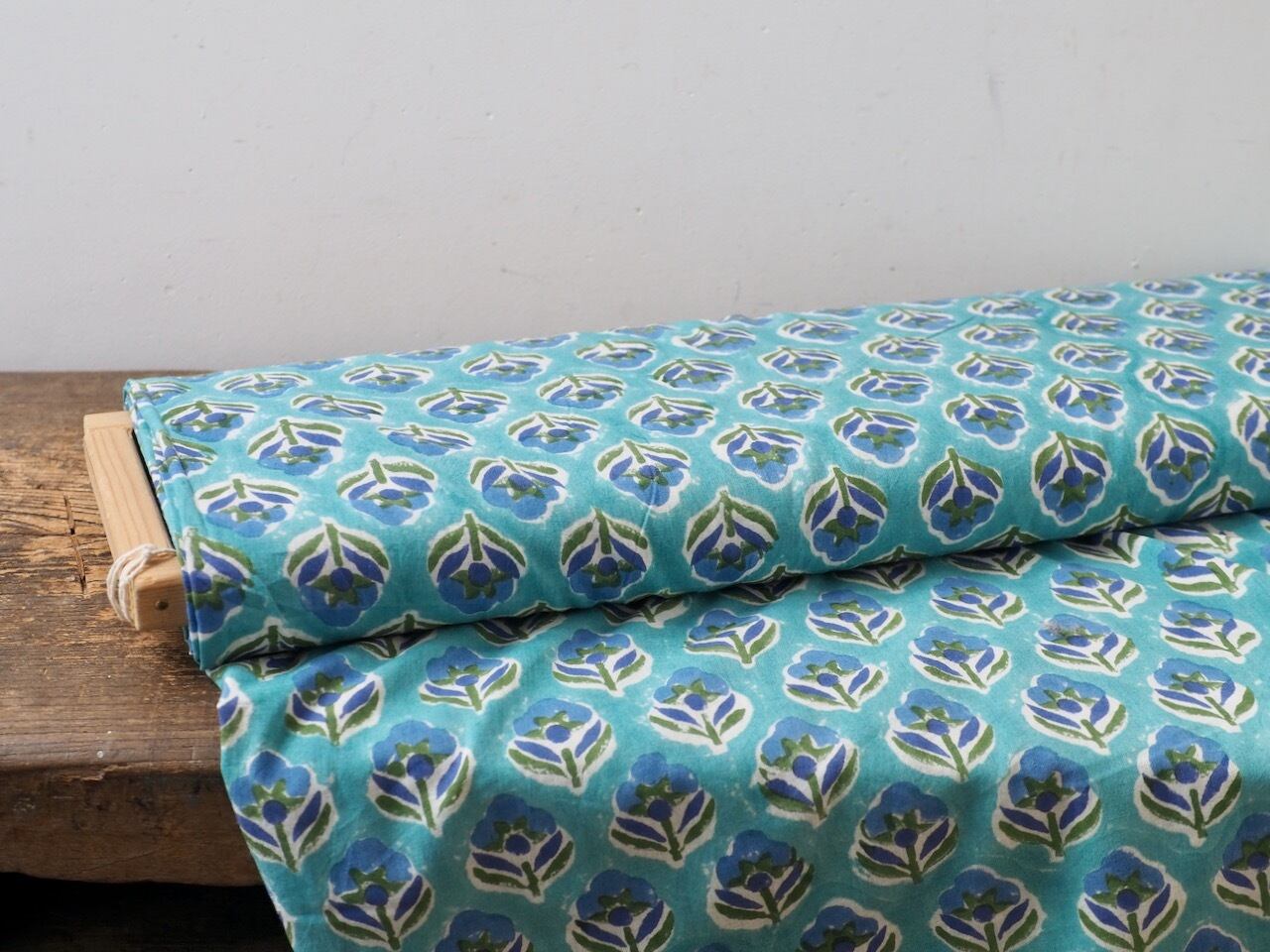 ブロックプリントと呼ばれるインド の伝統的な技法でプリントされた生地。木版で版画のように色を重ねていきます。時には10色以上重ねられることも!それゆえに木版の継ぎ目が見えたり、色むらがあったりしますが、それが一般的なスクリーンプリントにはない、なんとも言えない立体感を生み出しています。