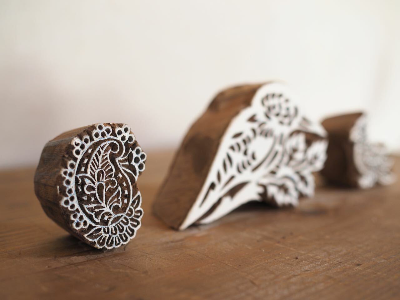 ブロックプリントは木版を使って生地にプリントをするインドの伝統的な技術です。その木版をディスプレイ用に作ってもらいました。もちろんインクをつけて紙などにプリントすることもできます。