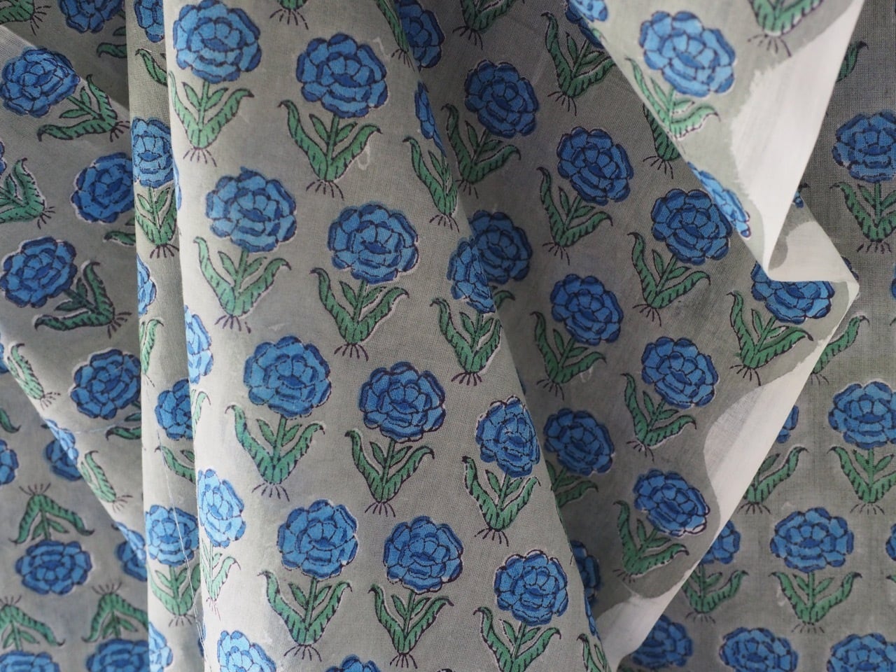 ブロックプリントと呼ばれるインド の伝統的な技法でプリントされた生地。木版で版画のように色を重ねていきます。時には10色以上重ねられることも!それゆえに木版の継ぎ目が見えたり、色むらがあったりしますが、それが一般的なスクリーンプリントにはない、なんとも言えない立体感を生み出しています。