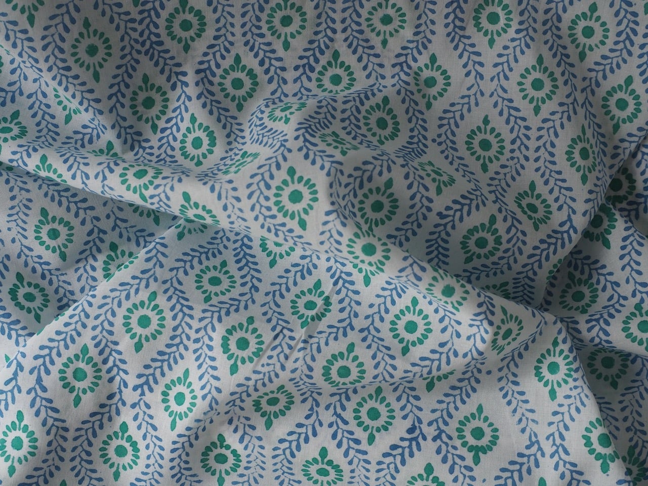 ブロックプリントと呼ばれるインド の伝統的な技法でプリントされた生地。木版で版画のように色を重ねていきます。時には10色以上重ねられることも!それゆえに木版の継ぎ目が見えたり、色むらがあったりしますが、それが一般的なスクリーンプリントにはない、なんとも言えない立体感を生み出しています。
