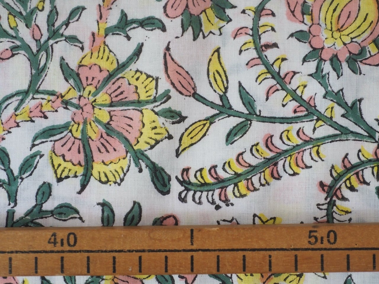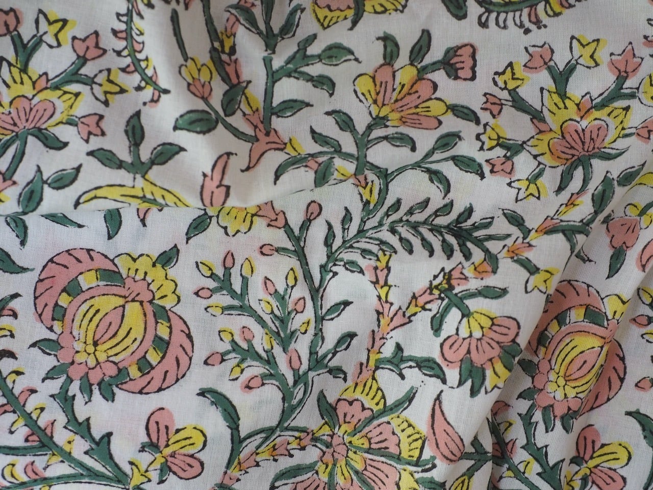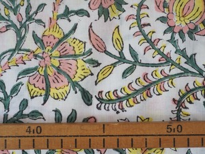ブロックプリントと呼ばれるインド の伝統的な技法でプリントされた生地。木版で版画のように色を重ねていきます。時には10色以上重ねられることも!それゆえに木版の継ぎ目が見えたり、色むらがあったりしますが、それが一般的なスクリーンプリントにはない、なんとも言えない立体感を生み出しています。