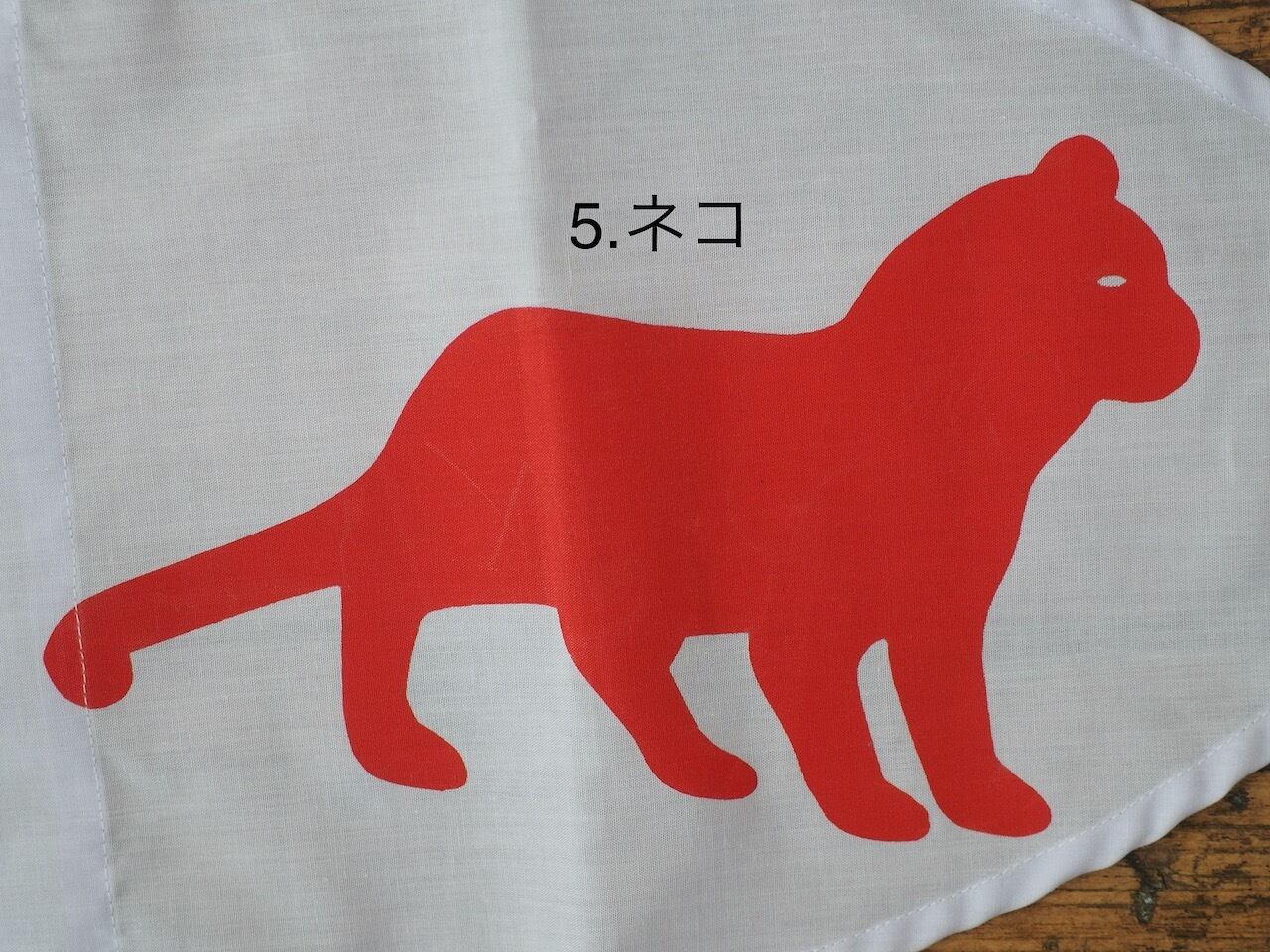 タイ語で動物名が書かれている左上の部分も縫われているので、下から棒を刺して旗にするタイプです。